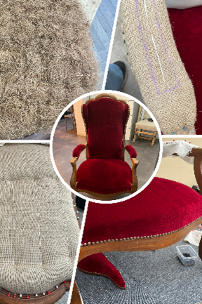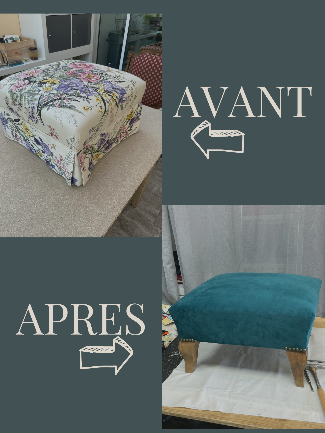 Dépose de l’ancien tissu, pose du nouveau revêtement et finitions sur l’ensemble du siège. Une manière simple et élégante de redonner du style à votre meuble..